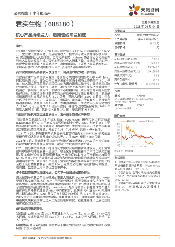 本报告对君实生物2023年半年度报告进行了深入分析,核心观点如下: