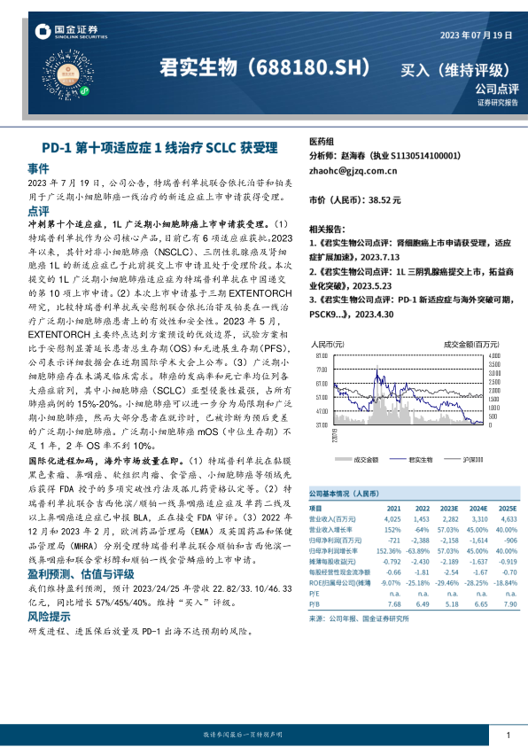 本报告分析了君实生物核心产品特瑞普利单抗的最新进展,包括其广泛期小细胞肺癌一线治疗新适应症上市申请获受理,以及国际化进程的加速。基于 EXTENTORCH 研究的积极数据,特瑞普利单抗有望满足广泛期小细胞肺癌患者的临床需求。同时,该药物在海外市场获得多项认证,多个适应症的上市申请正在接受 FDA 和 EMA 的审评,预示着公司未来的业绩增长潜力。维持对君实生物的“买入”评级,但同时也提示了研发、医保及出海等方面的风险。