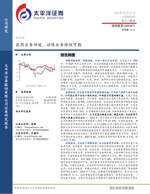 根据盈利预测,公司2024/25/26年收入预计分别为60.01/68.17/78.28亿元,归母净利润分别为8.33/10.00/12.00亿元,对应当前PE为11/9/8倍。与可比公司华海药业、普洛药业、仙琚制药的平均PE(2024-2026年分别为17倍、14倍、11倍)相比,国邦医药的估值显著偏低。考虑到公司主要产品市占率高、产业链完备,未来有望实现30个规模化产品全球领先、80个产品常规化生产、具备120个产品生产能力,公司收入及利润有望保持快速增长。