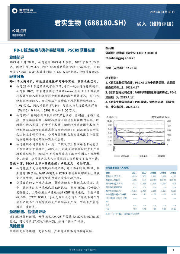 本报告分析了君实生物2023年一季度业绩,核心观点如下: