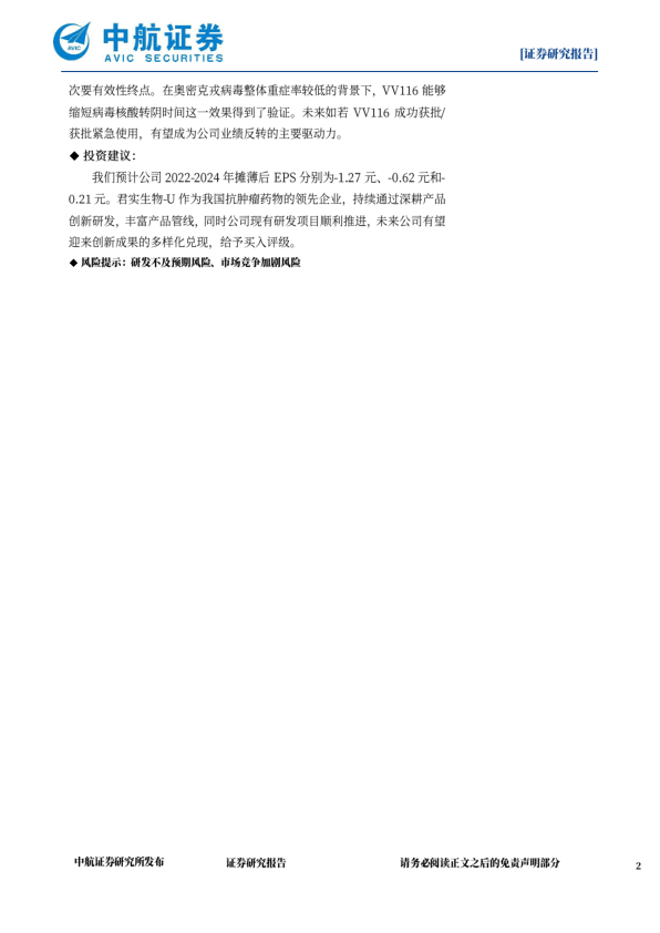 我们预计公司2022-2024年摊薄后EPS分别为-1.27元、-0.62元和-0.21元。君实生物-U作为我国抗肿瘤药物的领先企业,持续通过深耕产品创新研发,丰富产品管线,同时公司现有研发项目顺利推进,未来公司有望迎来创新成果的多样化兑现,给予买入评级。