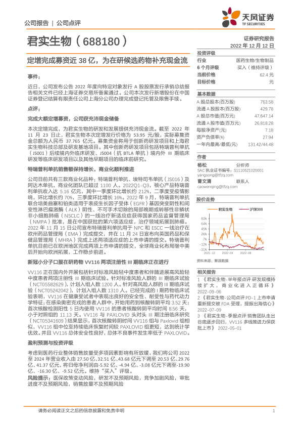 本报告对君实生物近期的发展情况进行了全面分析。公司成功完成大额定增,为研发和发展提供了充足的资金保障。核心产品特瑞普利单抗销售额持续增长,商业化进展顺利,并积极拓展海外市场。在研新冠小分子口服药物VV116的临床试验数据表现良好,有望成为新的增长点。尽管考虑到行业因素对公司盈利预测进行了调整,但维持“买入”评级。投资者应关注医保政策、研发进展、市场竞争等风险因素。