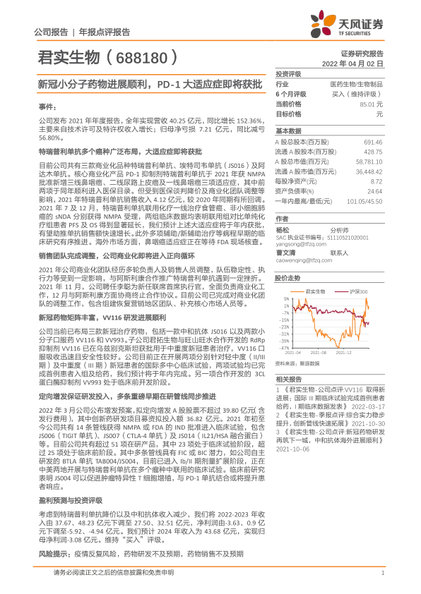 本报告对君实生物2021年年报进行了深入分析,指出特瑞普利单抗大适应症获批在即、新冠药物研发进展顺利以及商业化团队调整完成是公司未来发展的关键驱动力。尽管短期内面临业绩压力,但公司凭借强大的研发实力和丰富的产品管线,有望实现长期增长。维持“买入”评级,表明对公司未来发展前景的信心。