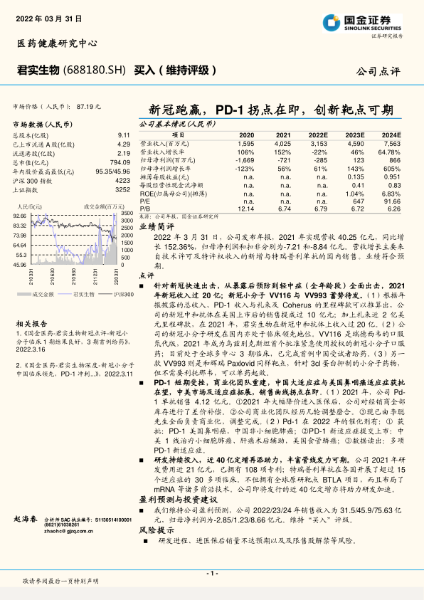 君实生物在2021年凭借新冠中和抗体业务实现了营收的爆发式增长,同时其新冠小分子药物研发也取得了重要进展。尽管PD-1单抗销售短期承压,但随着商业化策略的调整和多项适应症在中美市场的获批及提交,PD-1业务有望在2022年迎来销售拐点。公司持续高强度的研发投入和即将完成的近40亿元定增,将为未来创新管线的拓展和长期发展提供坚实支撑。综合来看,君实生物展现出强大的创新能力和市场潜力,国金证券维持“买入”评级,但投资者需关注研发进展、销量及限售股解禁等风险。