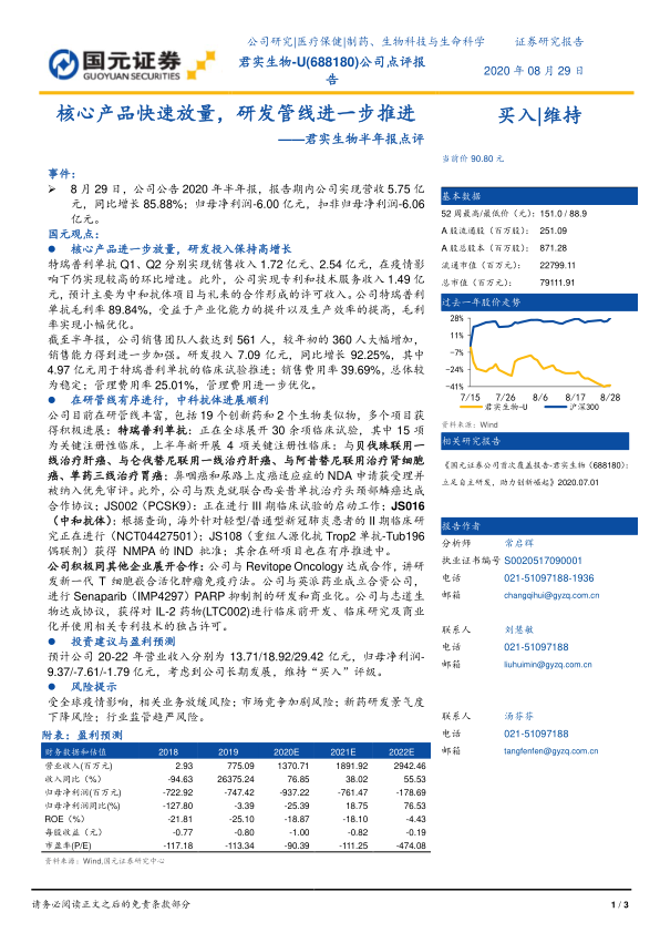 本报告对君实生物-U(688180)2020年半年报进行了分析,核心观点如下: