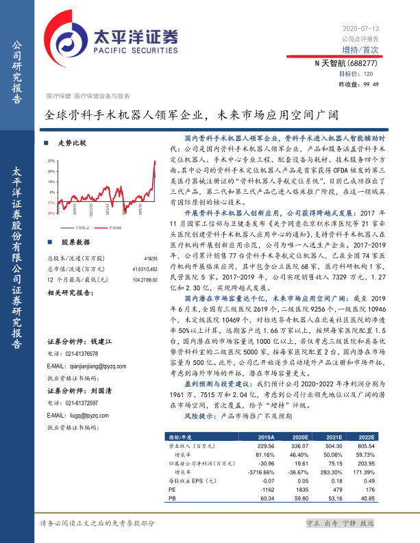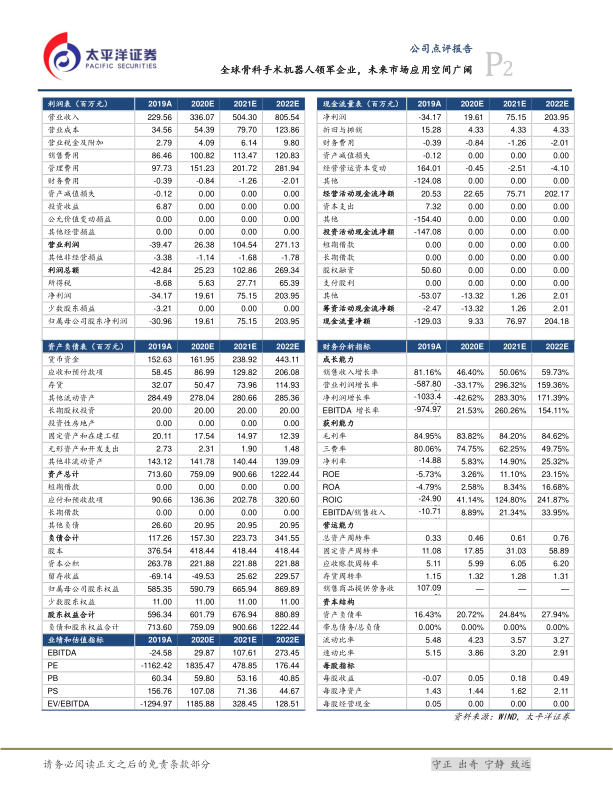 天智航作为国内骨科手术机器人领域的领军企业,凭借其国际原创的核心技术和CFDA认证的骨科手术定位机器人,在国家政策的积极支持下,实现了快速的市场拓展和显著的业绩增长。公司产品已成功应用于全国74家医疗机构,营收从2017年的7329万元增长至2019年的2.30亿元。国内骨科手术机器人市场潜力巨大,预计市场容量可达千亿级别,且公司已积极启动海外市场布局,进一步拓宽了增长空间。基于其行业领先地位和广阔的市场前景,预计公司未来几年将实现显著的盈利增长,因此首次覆盖给予“增持”评级。