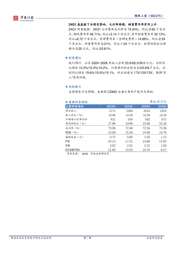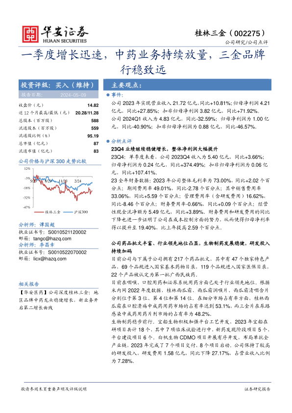 本报告分析了桂林三金2023年的业绩表现和2024年一季度的经营情况,认为公司在中药业务方面保持稳健增长,并在生物制药领域积极布局。虽然2024年一季度业绩受到高基数影响有所下滑,但公司整体盈利能力良好,成本控制有效。维持对公司“买入”的投资评级,并对公司未来几年的收入和利润增长持乐观态度。