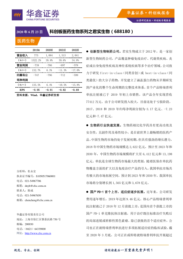 本报告采用历史估值法和绝对估值DCF法对君实生物进行了估值分析。