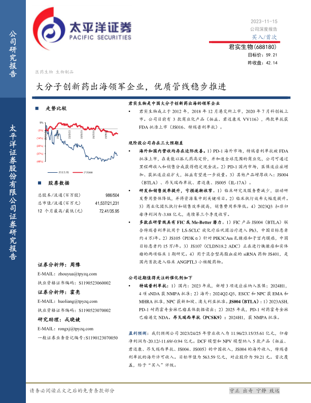 盈利预测:我们预测公司2023/24/25年营业收入为11.96/23.15/35.61亿元,归母净利润为-20.12/-11.69/-0.94亿元。DCF模型和NPV模型纳入5款产品(拓益、君迈康、昂戈瑞西单抗、JS004、JS005)的中国收入,JS004的海外收入,特瑞普利单抗的海外许可收入。目标市值为563.59亿元,对应股价为59.21元。首次覆盖,给予“买入”评级。