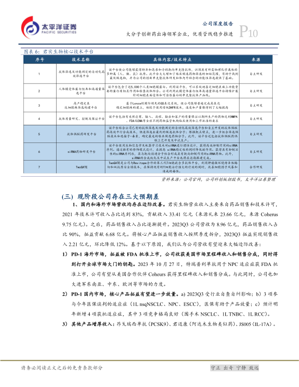 君实生物成立于2012年,并于2018年和2020年分别在港交所和科创板上市,目前拥有拓益(特瑞普利单抗)、君迈康(阿达木单抗生物类似药)和VV116(新冠口服药)三款商业化产品。其中,特瑞普利单抗于2023年10月27日获FDA批准用于鼻咽癌(NPC)适应症,成为首款获FDA批准的国产PD-1单抗,标志着公司在全球市场取得重大突破。公司还拥有七大核心技术平台,包括抗体偶联药研发平台和siRNA药物研发平台,这些平台是其开发单抗、双抗、ADC、siRNA等多种药物类型的基础,支撑了近30项临床阶段和20余项临床前阶段的在研产品管线。公司管理团队经验丰富,如CEO李宁博士曾任美国FDA审评官,全球研发总裁邹建军博士在肿瘤药物研发领域拥有近30年经验,为公司的创新发展提供了坚实保障。