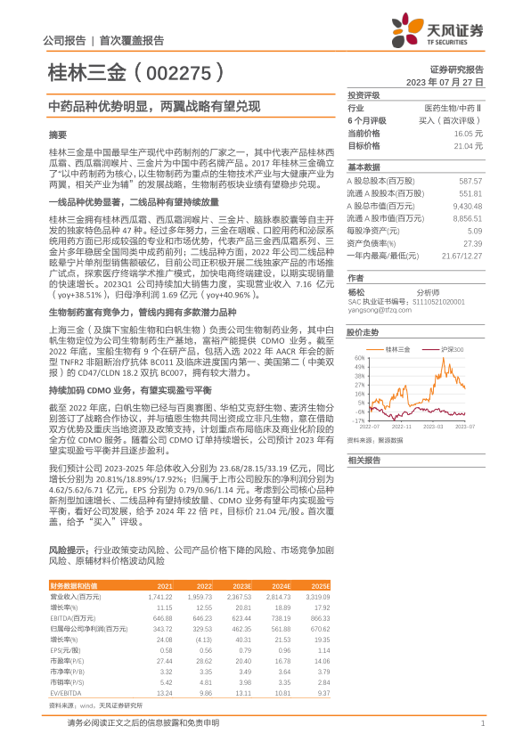 我们预计公司2023-2025年总体收入分别为23.68/28.15/33.19亿元,同比增长分别为20.81%/18.89%/17.92%;归属于上市公司股东的净利润分别为4.62/5.62/6.71亿元,EPS分别为0.79/0.96/1.14元。考虑到公司核心品种新剂型加速增长、二线品种有望持续放量、CDMO业务有望年内实现盈亏平衡,看好公司发展,给予2024年22倍PE,目标价21.04元/股。首次覆盖,给予“买入”评级。
