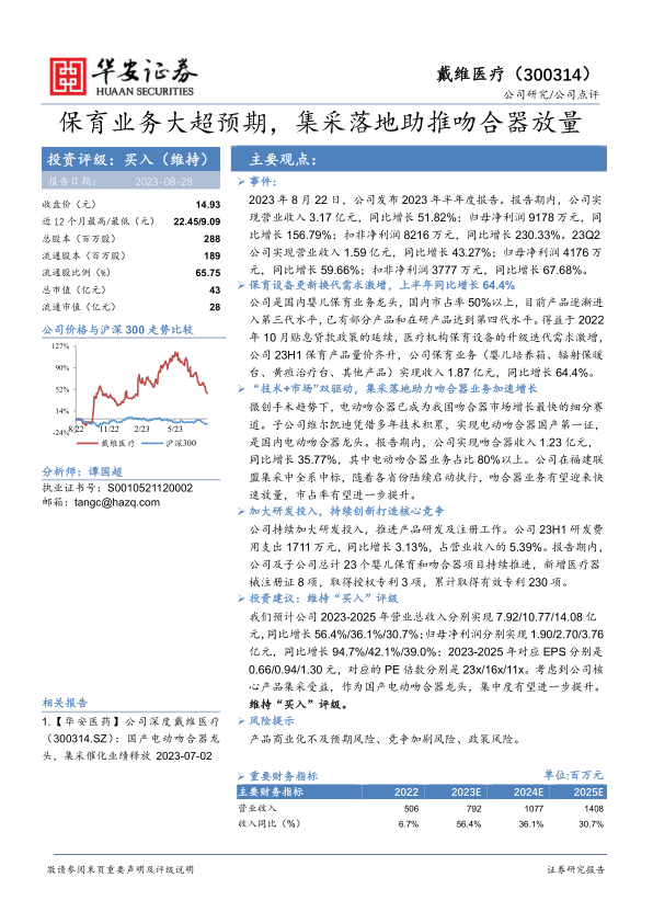 戴维医疗2023年上半年业绩表现亮眼,营业收入和归母净利润均实现高速增长,远超市场预期。这主要得益于其在婴儿保育设备和吻合器两大核心业务领域的强劲表现。保育业务受益于医疗机构设备更新换代需求和政策支持,实现64.4%的收入增长;吻合器业务则在微创手术趋势和集采落地背景下加速放量,其中电动吻合器作为国产龙头,市场份额有望进一步提升。公司持续加大研发投入,不断创新,巩固了技术优势。分析师维持“买入”评级,并预计公司未来几年将保持高速增长,但需关注产品商业化、市场竞争和政策变化等潜在风险。