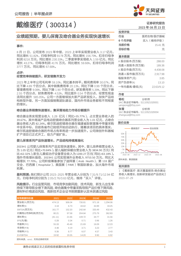 戴维医疗2023年中报业绩表现亮眼,营收和净利润均实现大幅增长。婴儿保育系列产品和吻合器业务是主要增长动力,海外市场拓展也取得显著成效。公司通过提升经营效率、加大研发投入、加强销售团队建设等方式,为未来发展奠定了坚实基础。 预计公司未来几年将保持快速增长态势,维持“买入”评级。但同时也需关注行业监管、市场竞争、技术风险以及新生儿出生率下降等风险因素。