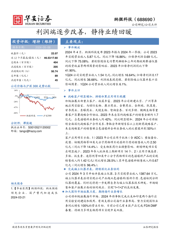 本报告分析了纳微科技2023年报和2024年一季报,指出公司通过积极拓展战略客户,特别是在大分子和小分子药物领域的应用,以及完成福立仪器并表,深化业务协同,从而在利润端逐步改善。报告维持对纳微科技的“增持”评级,并预测公司未来营收和净利润将实现显著增长。