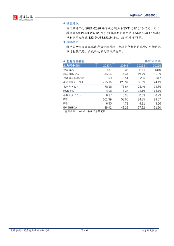 纳微科技通过拓展战略客户、深化业务协同和积极拓展海外市场,有望在利润端实现逐步改善。尽管面临生物医药行业调整和市场竞争等风险,公司在中小分子药物领域的增长以及福立仪器并表带来的协同效应,预示着公司业绩有望逐步回暖。维持“增持”评级,反映了对公司未来增长潜力的信心。