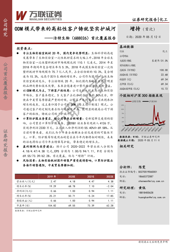 本报告对洁特生物(688026)进行了首次覆盖分析,认为公司作为国内生物实验室一次性耗材领域的领先企业,凭借20年深耕积累的品牌和技术优势,在国内市场竞争中占据有利地位。公司以ODM模式为主,构建了高粘性的下游客户关系,有效抵御了外部风险。同时,受新冠疫情影响,公司重启的口罩防护服业务在短期内为业绩带来了显著增量。尽管面临疫情和贸易摩擦等风险,但公司财务状况稳健,盈利能力持续提升,研发投入保障了长期竞争力。基于对各业务板块的盈利预测,预计公司未来三年营收和净利润将保持增长。首次覆盖给予“增持”评级,建议投资者关注其在生物医药产业快速发展和进口替代背景下的成长潜力。