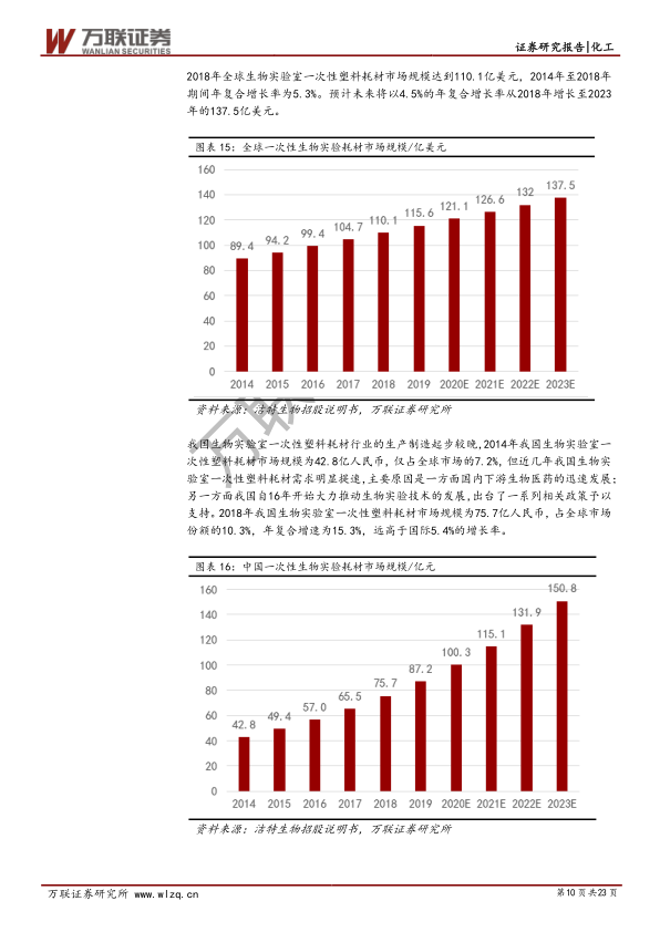 - 2018年全球生物实验室一次性塑料耗材市场规模达110.1亿美元,2014-2018年复合增长率为5.3%,预计2018-2023年将以4.5%的复合增长率增长至137.5亿美元。