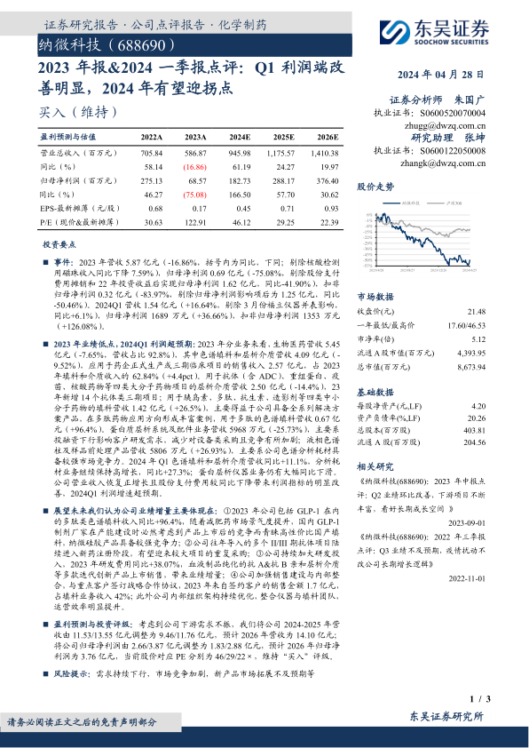 纳微科技在2023年经历了业绩低谷,但2024年第一季度利润端表现出显著改善,预示着公司有望迎来业绩拐点。这一积极趋势主要由多肽类色谱填料市场景气度提升、前期抗体项目进入注册阶段带来的重复采购、持续的研发创新以及销售与内部整合效率提升等因素共同驱动。尽管面临需求下行和市场竞争加剧的风险,但公司凭借其在生物医药领域的深厚积累和产品竞争力,预计未来业绩将实现恢复性增长。基于调整后的盈利预测,东吴证券维持对纳微科技的“买入”评级。