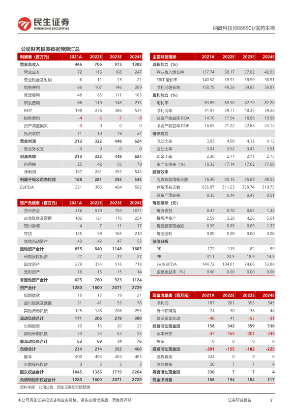 投资建议:公司所处行业增长快速,长期空间明确,公司具有先发优势,作为龙头地位稳固。随着公司研发项目的不断落地和产品结构的优化,预计 2022-2024 年,归母净利润分别为 2.81、 3.93 及 5.45 亿元,同比增长 49.3%, 39.8%,38.9%,EPS 分别为 0.70、0.97 及 1.35 元,PE 分别为 115、82 及 59,维持“推荐”评级。