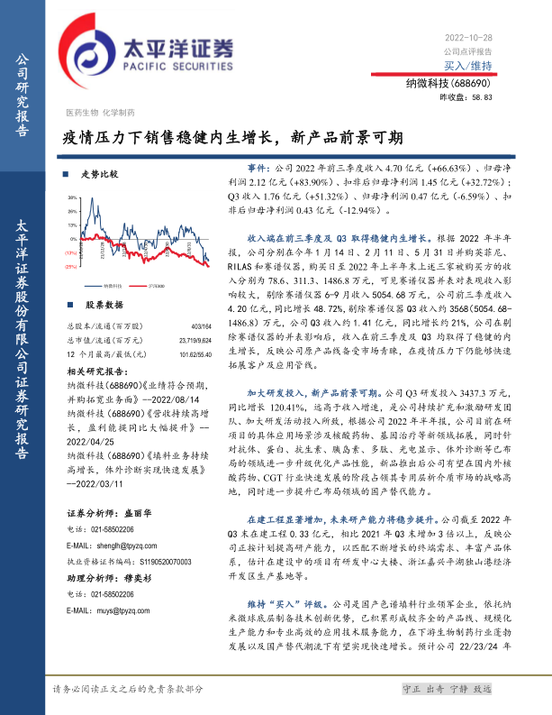 纳微科技在2022年前三季度展现出强劲的业绩增长势头,尤其在剔除并购影响后,其核心业务仍保持稳健的内生增长。公司持续加大研发投入,积极布局核酸药物、基因治疗等前沿领域,并同步推进产能建设,以应对市场需求和加速国产替代进程。鉴于公司在国产色谱填料领域的领先地位及其在生物制药行业国产替代浪潮中的发展潜力,太平洋证券维持其“买入”评级,并预计未来三年盈利将持续增长。同时,报告也提示了客户拓展、订单、新产品开发及价格波动等潜在风险,建议投资者关注。