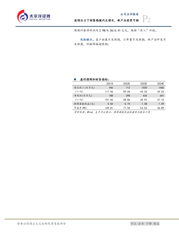 风险提示。客户拓展不及预期,订单量不及预期,新产品开发不及预期,价格降幅超预期。