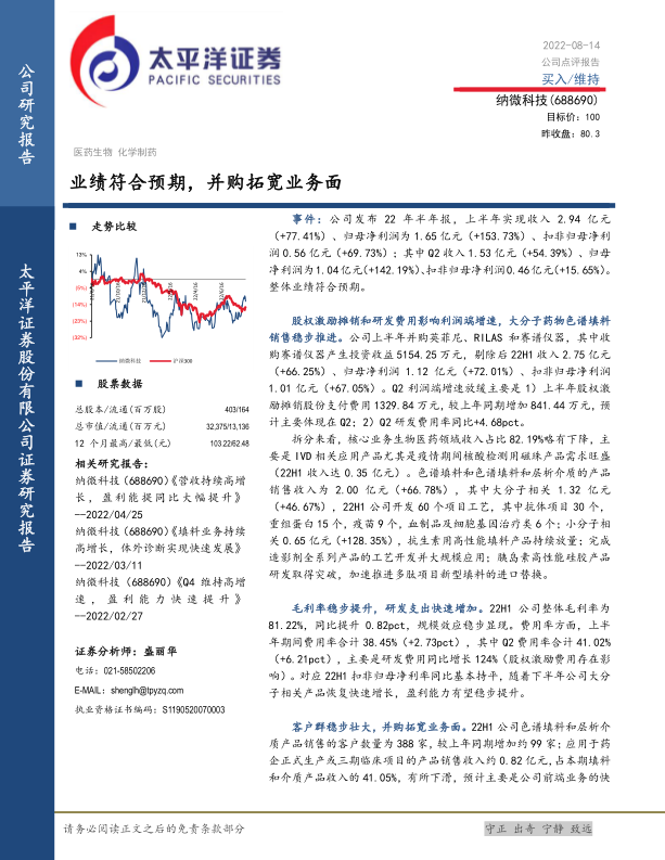 纳微科技在2022年上半年展现出强劲的业绩增长势头,收入和净利润均实现大幅提升,符合市场预期。公司通过积极的研发投入和一系列战略性并购,不仅巩固了其在生物医药色谱填料领域的领先地位,还成功拓展了分离纯化仪器、海外市场及磁珠微球材料等新业务领域,构建了更为多元化的增长引擎。尽管短期内股权激励摊销和研发费用增加对利润增速构成一定压力,但公司毛利率的稳步提升、客户群的持续壮大以及新产品研发的丰硕成果,预示着其未来盈利能力的持续改善。鉴于公司在国产替代浪潮中的核心竞争力及其在生物制药行业的广阔发展前景,太平洋证券维持“买入”评级,并对其未来几年的高速增长抱有积极预期。