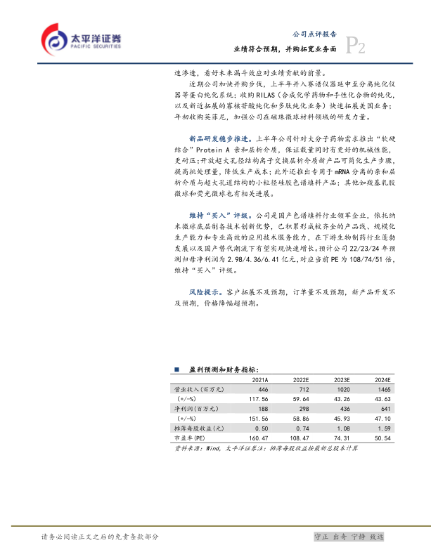 维持“买入”评级。公司是国产色谱填料行业领军企业,依托纳米微球底层制备技术创新优势,已积累形成较齐全的产品线、规模化生产能力和专业高效的应用技术服务能力,在下游生物制药行业蓬勃发展以及国产替代潮流下有望实现快速增长。预计公司22/23/24年预测归母净利润为2.98/4.36/6.41亿元,对应当前PE为108/74/51倍,维持“买入”评级。