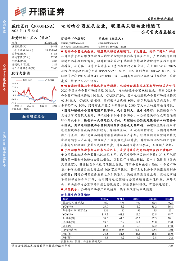 公司全资子公司维尔凯迪为国内电动腔镜吻合器赛道龙头企业,产品不断迭代创新满足临床微创化需求,福建联盟集采政策落地有望推动电动腔镜吻合器业务快速增长,公司婴儿保育业务为基石业务可提供稳定现金流,我们预计公司2022-2024年归母净利润分别为0.95/1.55/2.31亿元,EPS分别为0.33/0.54/0.80元,当前股价对应P/E分别为43.6/26.8/18.0倍,与同类公司相比具备估值性价比,首次覆盖,给予“买入”评级。