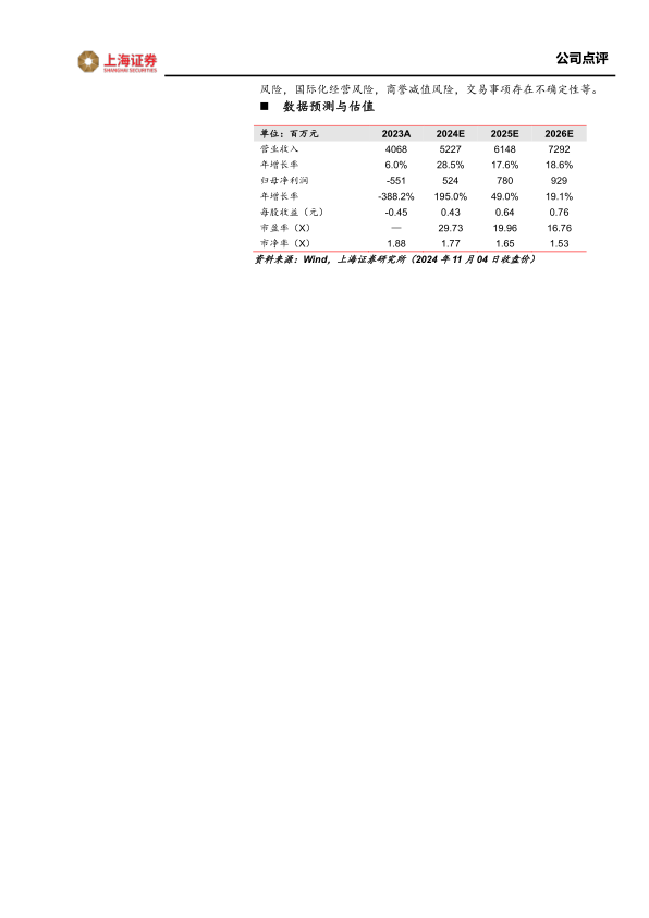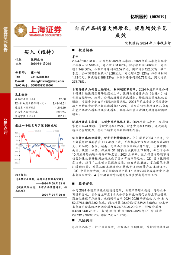 公司2024年前三季度业绩增速亮眼,自有产品增长迅速,海外业务实现新突破。首个自主研发I类大分子创新生物药亿立舒上市注册及商业化进程有序进行。我们预计公司2024-2026年营业收入分别为52.27/61.48/72.92亿元,同比增长28.49%/17.63%/18.60%;归属于上市公司股东的净利润分别为5.24/7.80/9.29亿元,EPS分别为0.43/0.64/0.76元。当前股价对应2024-2026年PE分别为29.73/19.96/16.76。维持“买入”评级。