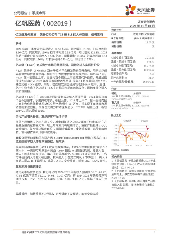 本报告主要分析了亿帆医药2024年前三季度的业绩表现,以及其创新药亿立舒(F-627)的海外市场进展和参股公司天劢源和的在研产品A-319在系统性红斑狼疮(SLE)适应症上的早期人体有效性数据。