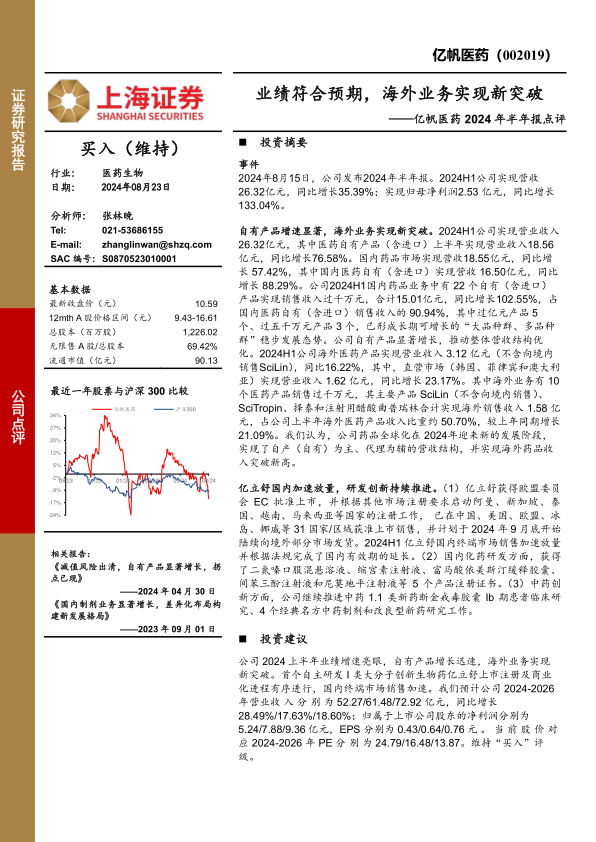 公司2024上半年业绩增速亮眼,自有产品增长迅速,海外业务实现新突破。首个自主研发I类大分子创新生物药亿立舒上市注册及商业化进程有序进行,国内终端市场销售加速。我们预计公司2024-2026年营业收入分别为52.27/61.48/72.92亿元,同比增长