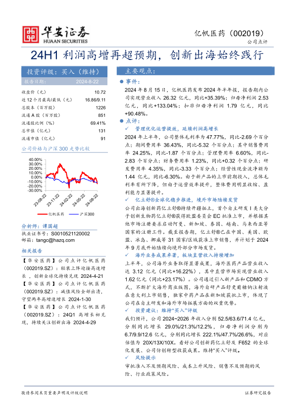 我们预计,公司2024~2026年收入分别52.5/63.6/71.4亿元,分别同比增长29.0%/21.3%/12.2%,归母净利润分别为6.7/9.9/12.6亿元,分别同比增长222.1%/47.7%/26.6%,对应估值为20X/13X/10X。看好公司创新药亿立舒及F652的全球化发展、公司仿创转型收获成果。维持“买入”评级。