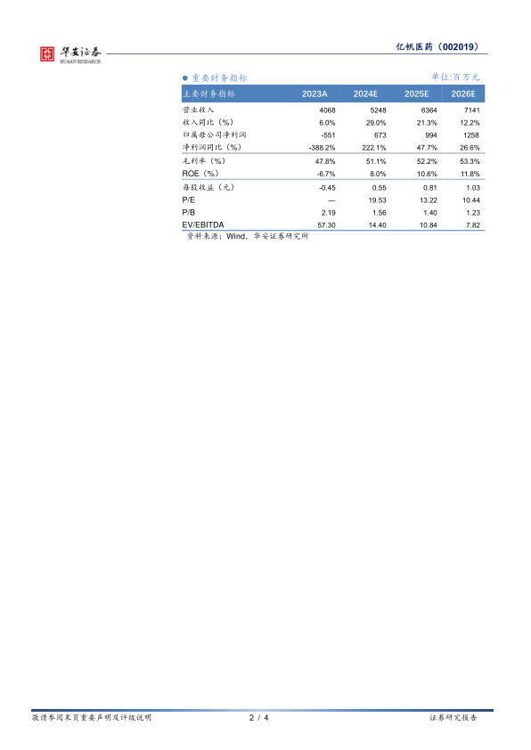 华安证券维持亿帆医药“买入”评级。预计公司2024年至2026年营业收入将分别达到52.5亿元、63.6亿元和71.4亿元,同比增速分别为29.0%、21.3%和12.2%。同期归母净利润预计分别为6.7亿元、9.9亿元和12.6亿元,同比增速分别为222.1%、47.7%和26.6%。对应估值分别为20倍、13倍和10倍市盈率。分析师看好公司创新药亿立舒及F652的全球化发展前景,以及公司仿创转型所带来的成果。同时,报告提示了审批准入不及预期、成本上升、销售不及预期以及行业政策等潜在风险。