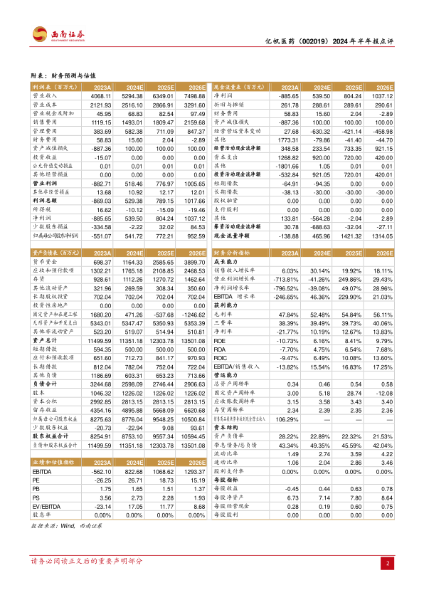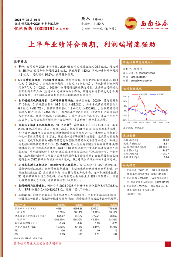 本报告分析了亿帆医药(002019)2024年半年度报告,核心观点如下: