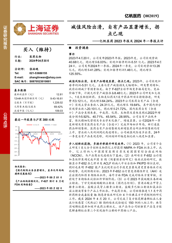 亿帆医药2023年报及2024年一季报点评:减值风险出清,自有产品显著增长,拐点已现