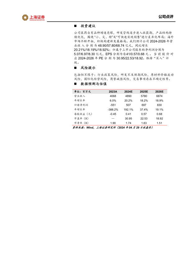 公司医药自有品种增速亮眼,研发管线逐步进入收获期,产品结构持续优化,围绕“小、尖、特”及“可快速实现销售”进行差异化布局;海外市场不断开拓,积极构建新发展格局。我们预计公司2024-2026年营业收入分别为48.90/57.80/68.74亿元,同比增长20.21%/18.19%/18.92%;归属于上市公司股东的净利润分别为5.07/6.97/8.30亿元,EPS分别为0.41/0.57/0.68元。当前股价对应2024-2026年PE分别为30.95/22.53/18.92。维持“买入”评级。