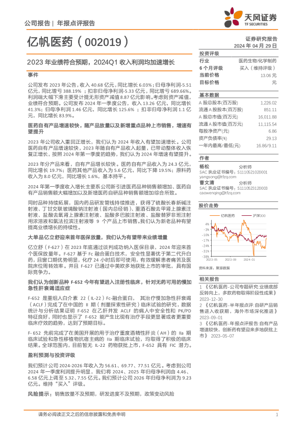 本报告分析了亿帆医药2023年的业绩表现,指出利润下滑主要受资产减值影响,但公司整体收入重回正增长。2024年一季度,公司收入和利润均加速增长,主要受益于医药自有产品和新引进品种的销售额增加。报告特别强调了亿立舒纳入医保后的放量潜力以及创新药F-652的研发进展。基于对公司未来收入和利润的预测,维持“买入”评级。