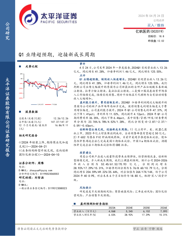 本报告对亿帆医药2024年第一季度业绩进行了深入分析,认为公司业绩超预期增长主要受益于新产品上市和销售策略调整。公司盈利能力提升,费用控制良好,创新转型和国际化战略稳步推进。基于对公司未来发展的乐观预期,报告上调了盈利预测,维持“买入”评级,并给出了目标价。同时,报告也提示了相关风险,为投资者提供了参考。