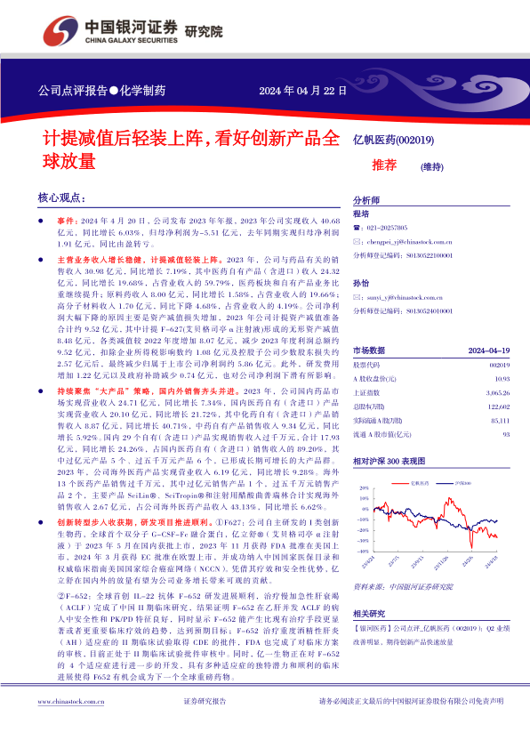 本报告的核心观点是,亿帆医药在2023年计提大额资产减值后,虽然短期业绩受到影响,但长期来看,这有助于公司轻装上阵,将资源更集中于具有增长潜力的创新产品。