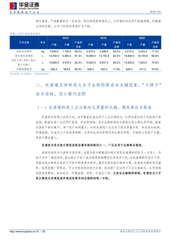 打破外企垄断,进口替代在即,突破空间极大: 预计到 2024 年全球色谱填料市场规模可达 30 亿美元;其中中国规模预计可达 14 亿元人民币, 2019-2024CAGR 达到 11.3%,为全球范围内增速最快的市场之一。公司色谱填料是生物药制备中最重要的分离方式,也是核心成本之一;预计我国生物药市场规模 2014-2018 年CAGR 为 22.4%, 2018-2023 年 CAGR 为 19.6%,高增速将快速带动上游层析介质市场的发展。从行业格局来看, 全球市场长期被 GE Health、 Tosoh、 Fuji 等行业巨头垄断, 2018 年 CR3 为 50%。公司已在国内开始进口替代放量,在国内 2019和 2020 市占率为 9.5%和 14.5%,增速明显且仍有极大空间。