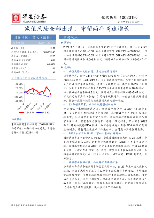 本报告分析了亿帆医药2023年业绩预告,指出公司通过一次性计提减值准备清除了风险,为未来增长奠定基础。公司在创新药研发和产品出海方面取得重要进展,艾贝格司亭α注射液国内外获批,F652有望成为下一个重磅产品。同时,公司前期布局的产品陆续获批,巩固了品类优势。维持“买入”评级,但需关注审批准入、成本、销售和政策风险。