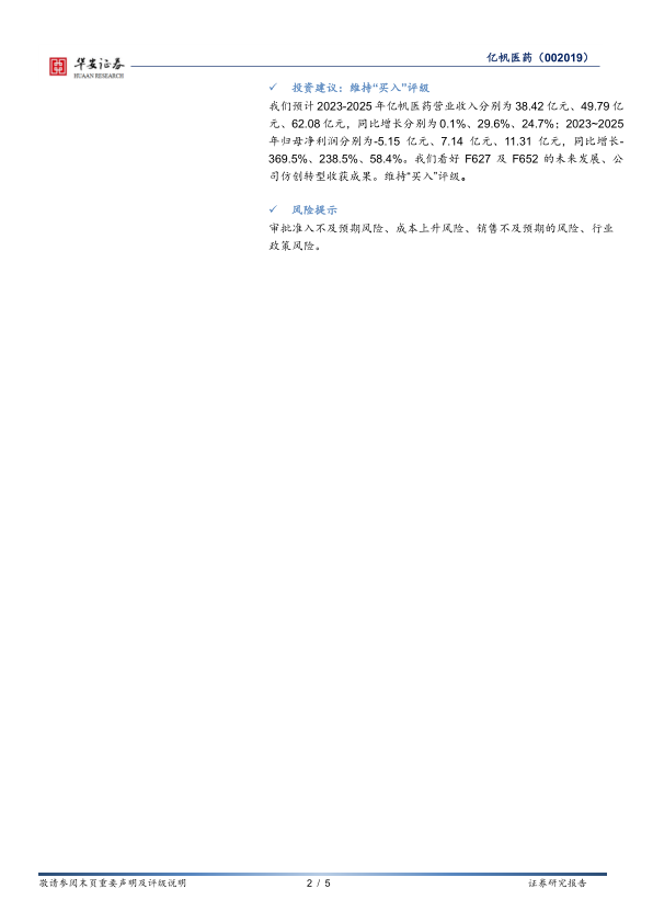 我们预计2023-2025年亿帆医药营业收入分别为38.42亿元、49.79亿元、62.08亿元,同比增长分别为0.1%、29.6%、24.7%;2023~2025年归母净利润分别为-5.15亿元、7.14亿元、11.31亿元,同比增长-369.5%、238.5%、58.4%。我们看好F627及F652的未来发展、公司仿创转型收获成果。维持“买入”评级。