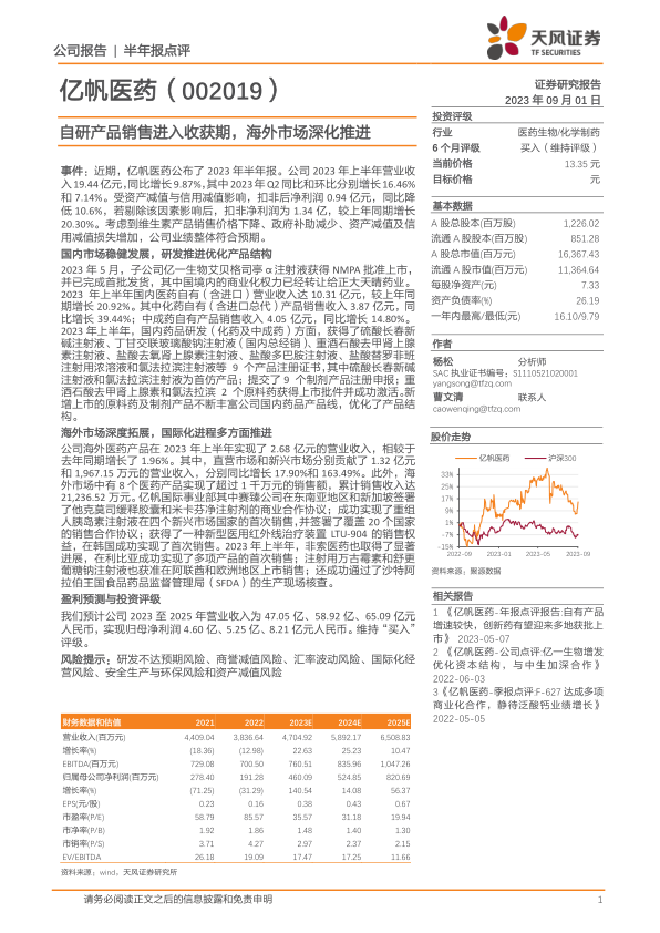 亿帆医药2023年上半年业绩稳健增长,国内市场和海外市场均取得积极进展。公司不断优化产品结构,加大研发投入,国际化进程加速。维持对公司未来发展的乐观预期和“买入”评级,但同时也需关注相关风险。