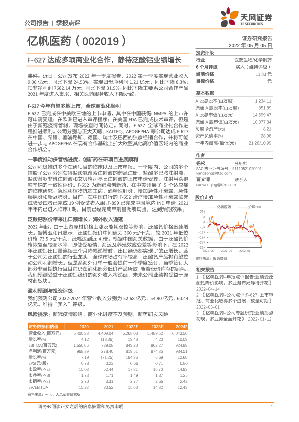 亿帆医药一季度业绩受到集采影响有所下滑,但F-627商业化进展顺利,创新药研发稳步推进,泛酸钙价格上涨有望带来业绩增长。维持“买入”评级,并需关注新冠疫情、商业化进度以及新药研发等风险。