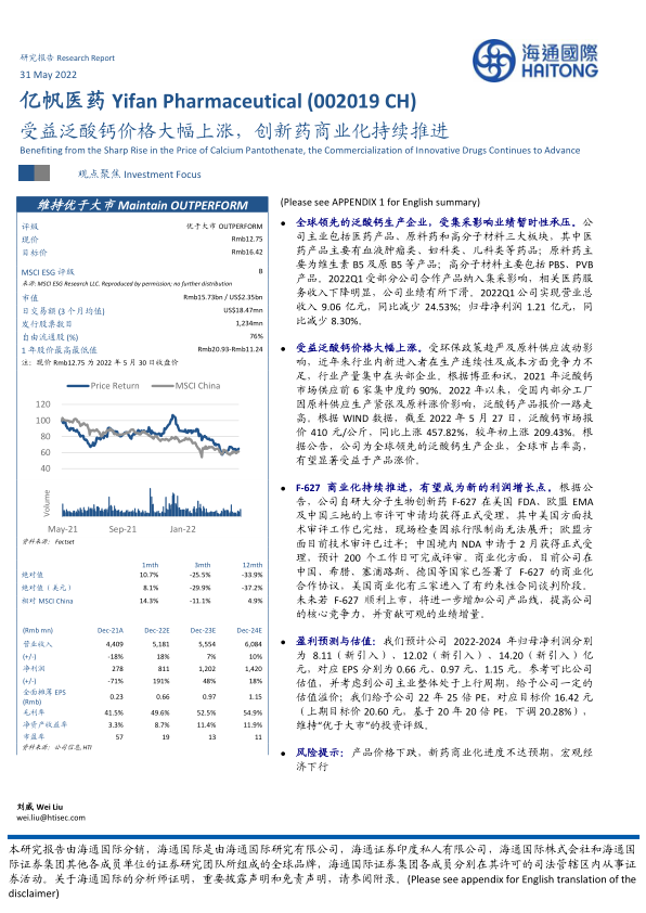本报告分析了亿帆医药的业务构成、业绩表现以及未来发展前景。核心观点是,公司将受益于泛酸钙价格上涨和创新药 F-627 的商业化,业绩有望实现快速增长。维持“优于大市”的投资评级,但需关注产品价格下跌、新药商业化进度以及宏观经济下行等风险。