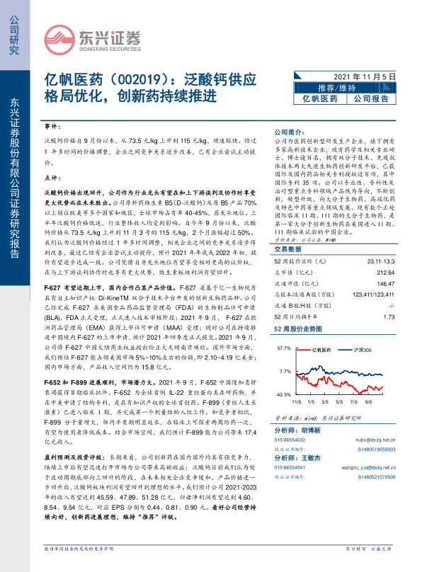 本报告分析了亿帆医药在泛酸钙市场和创新药研发方面的优势和潜力。泛酸钙价格的回升将有助于公司维生素板块利润的恢复,而创新药产品线,特别是F-627、F-652和F-899等,在国内外市场均具有强大的竞争力,有望在上市后迅速打开市场,为公司带来可观的收益。维持“推荐”评级,但需注意创新药研发不及预期、产品价格下跌风险、新药审批不达预期等风险。