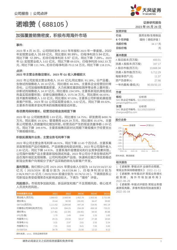 本报告对诺唯赞(688105)2022年年报和2023年一季度报进行了分析,核心观点如下: