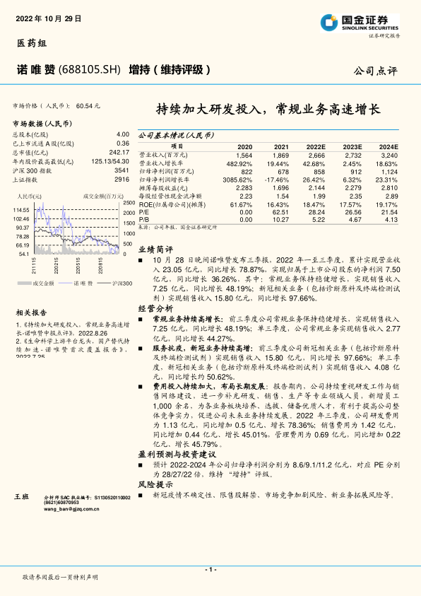 诺唯赞2022年上半年业绩表现亮眼,常规业务稳健增长,新冠相关业务超预期,境外市场拓展顺利,研发投入持续加大。维持“增持”评级,但需关注相关风险。