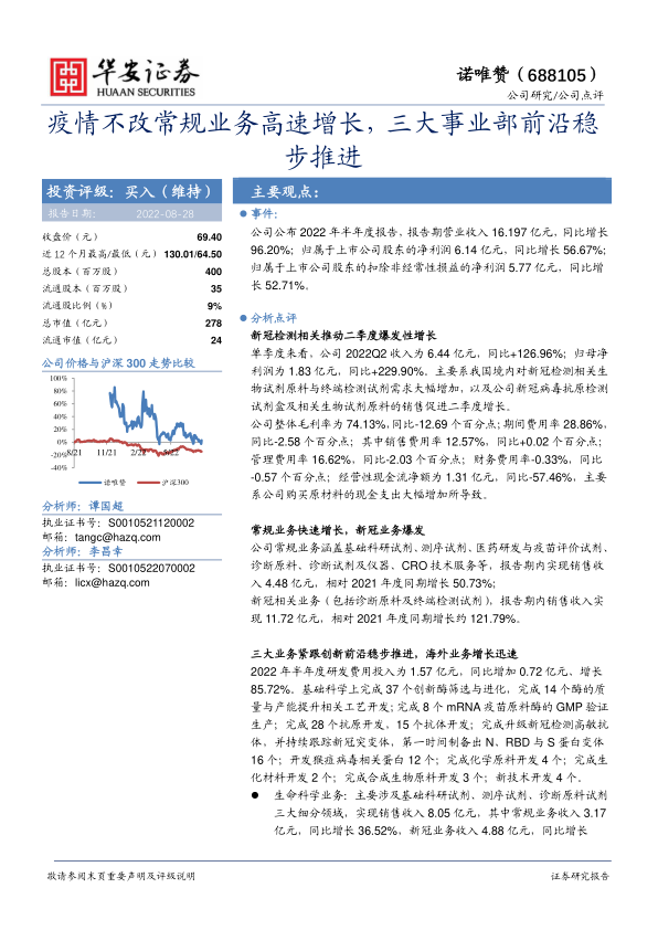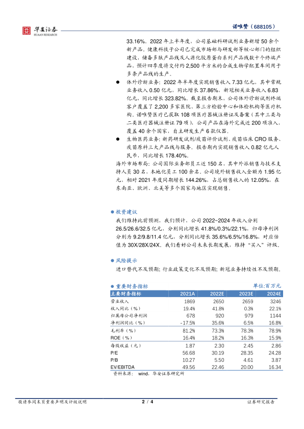 本报告对诺唯赞公司2022年半年度报告进行了详细分析,指出新冠检测业务是公司业绩增长的主要驱动力,常规业务保持稳健增长,三大业务板块紧跟创新前沿。同时,公司积极布局海外市场,未来发展潜力巨大。维持对公司“买入”评级,但需关注相关风险。