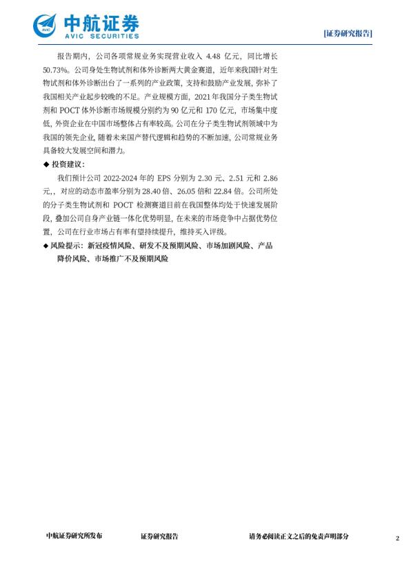 我们预计公司2022-2024年的EPS分别为2.30元、2.51元和2.86元,,对应的动态市盈率分别为28.40倍、26.05倍和22.84倍。公司所处的分子类生物试剂和POCT检测赛道目前在我国整体均处于快速发展阶段,登加公司自身产业链一体化优势明显,在未来的市场竞争中占据优势位置,公司在行业市场占有率有望持续提升,维持买入评级
